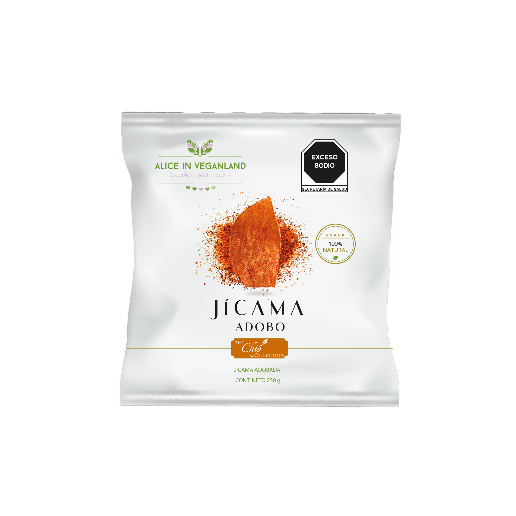 Deliciosas chips de jícama adobada deshidratada con un sabor único y textura crujiente que satisface tu antojo. Prueba la diferencia de calidad y transparencia que ofrece Alice in Veganland